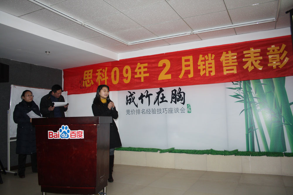 2009年3月6日我司2月份銷售銷售大會在公司七樓會議室隆重舉行,這是2009年度舉行的第一次銷售總結大會。公司所有員工在會議中分享各自的心得體會,互相學習,共同成長。會議在熱烈的的氣氛中落下了帷幕。