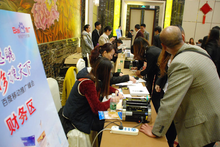 現(xiàn)場(chǎng)企業(yè)家向工作人員咨詢百度移動(dòng)搜索推廣